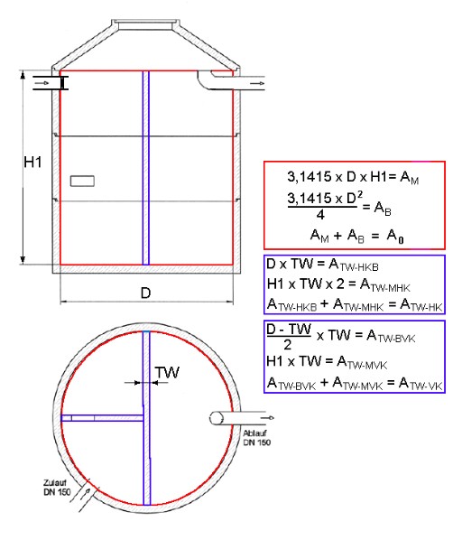 Die Berechnung des Grundkörpers ist bei allen Beton-Behältervarianten gleich (siehe Abbildung - roter Kasten). Das Ergebnis A0 notieren